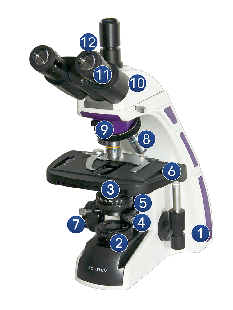 - Kondenzor – Vytvára nastaviteľný svetelný kužeľ. Pomocou kondenzora sa dá regulovať nielen množstvo svetla, ale aj jeho uhol a rozptyl; obsahuje nastaviteľnú clonu svetla.