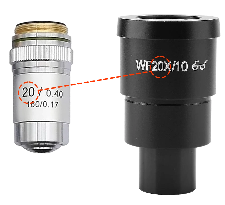 Na okulároch sa často nachádza iba jedno číslo so znakom násobenia. Tento údaj sa musí vynásobiť číslom na objektíve, aby sme získali celkové zväčšenie. Okrem toho sa na okulároch môžeme stretnúť so skratkou „WF“, ktorá označuje širšie zorné pole, číslom udávajúcim vzdialenosť pupíl a piktogramom okuliarov. Posledný znak znamená, že do okulárov s väčšou pupillárnou vzdialenosťou je možné pozerať sa aj s okuliarmi, pričom sa využije celé zorné pole.