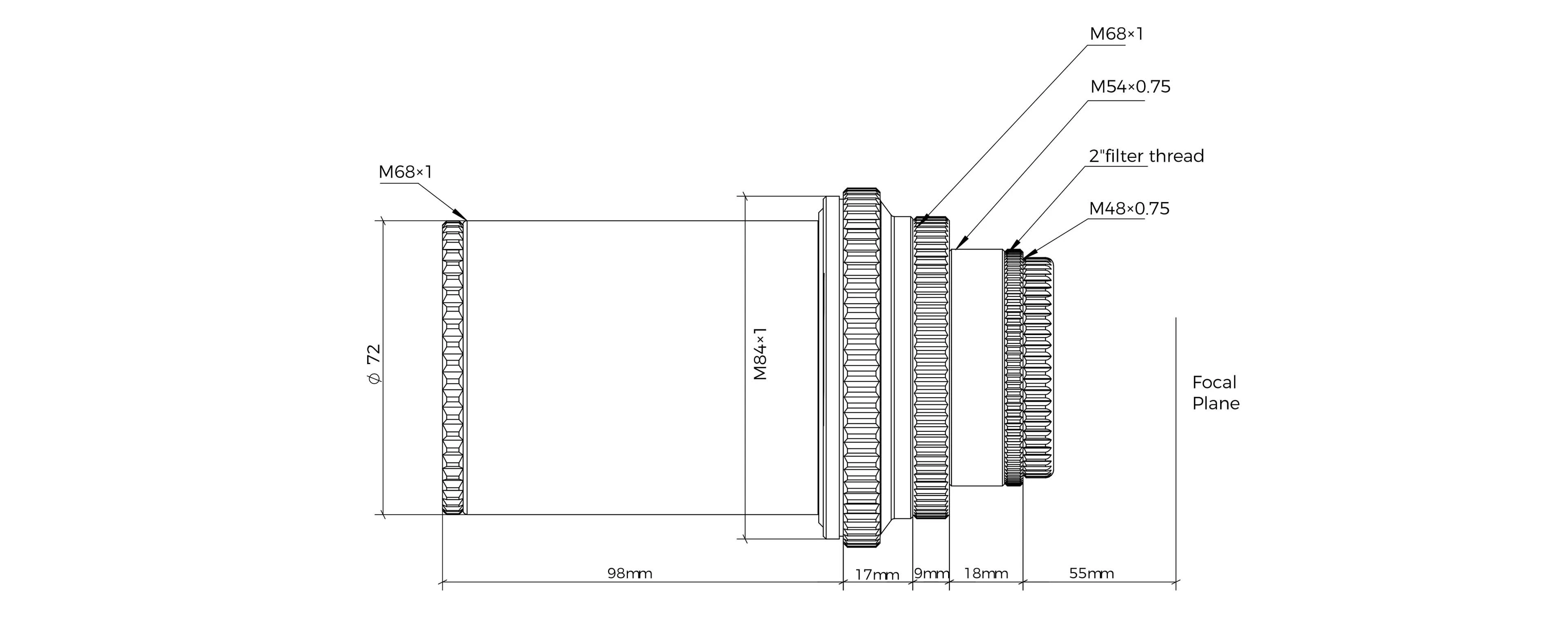 The reducer features a 44 mm image circle, making it fully suitable for use with full-frame cameras. On the camera side, M48, M54, and M68 threads are available, allowing for broad compatibility with various systems. With an M48 connection, the classic 55 mm sensor distance is achieved, which increases to 73 mm when using an M54 thread, and to 82 mm with an M68 thread.