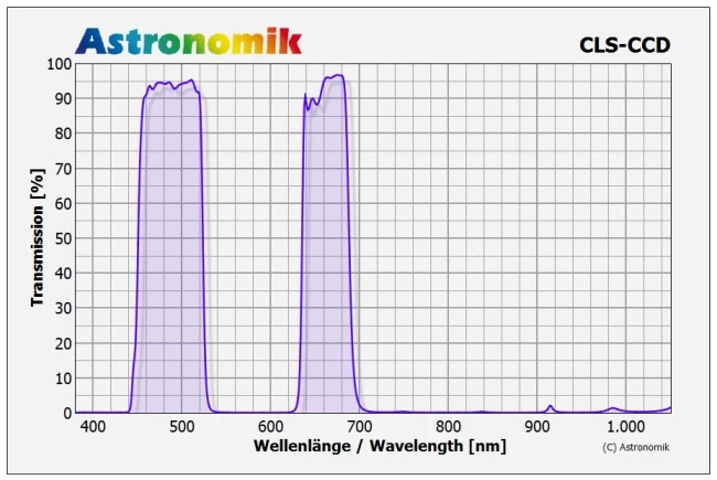 The Astronomik CLS is a general-purpose, broadband deep sky filter that is particularly suitable for both visual and photographic applications to reduce the harmful effects of light pollution. The filter can be purchased in two versions: the CCD version includes a UV/IR blocking layer, which is essential for photographic use when no such filter is available in front of the camera (e.g. astronomical CCD cameras, DSLR camera with filter removed). For visual use or a DSLR camera that has undergone a Baader filter change, any filter version can be used, in which case the CCD one has no advantage.