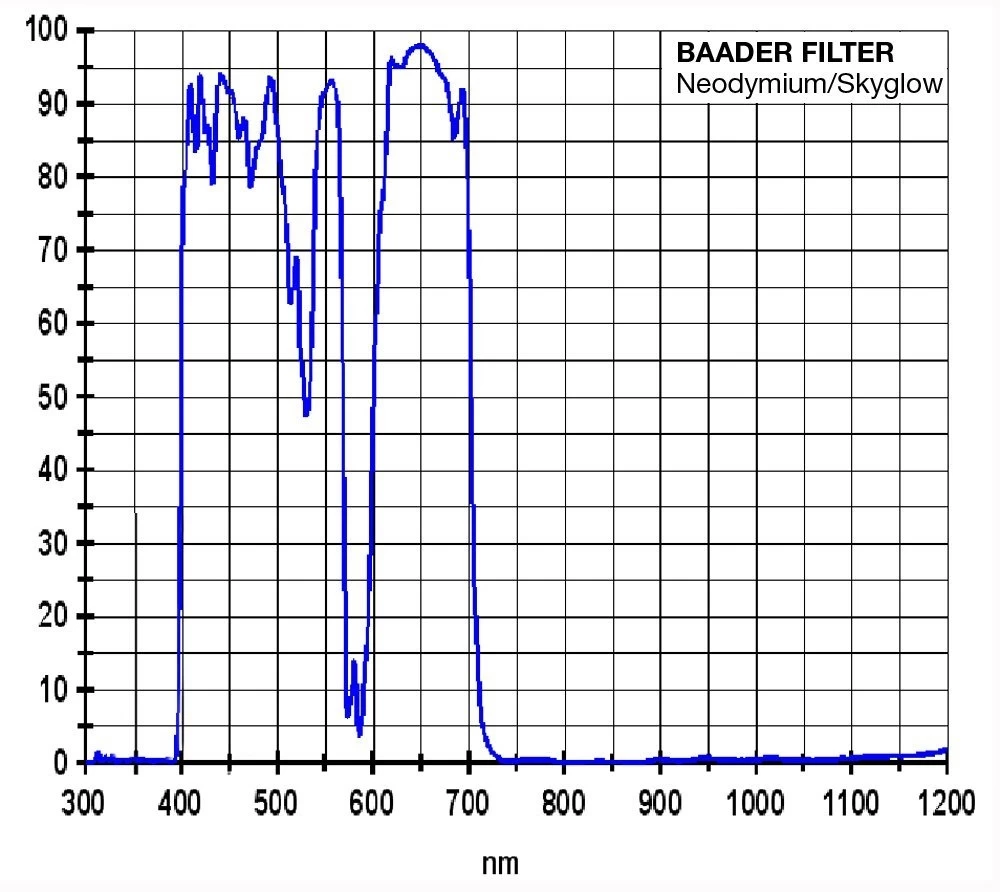 Baader Moon&SkyGlow filter's neodymium glass material filters out the wavelength range of streetlights, making the sky background darker. It also reduces the glare of moonlight and enhances the colours of the planetary sky without altering the tone of the image. By itself, it is poorly suited to correcting colour aberrations in acromatic lenses, and Baader Fringe Killer is recommended as a companion.