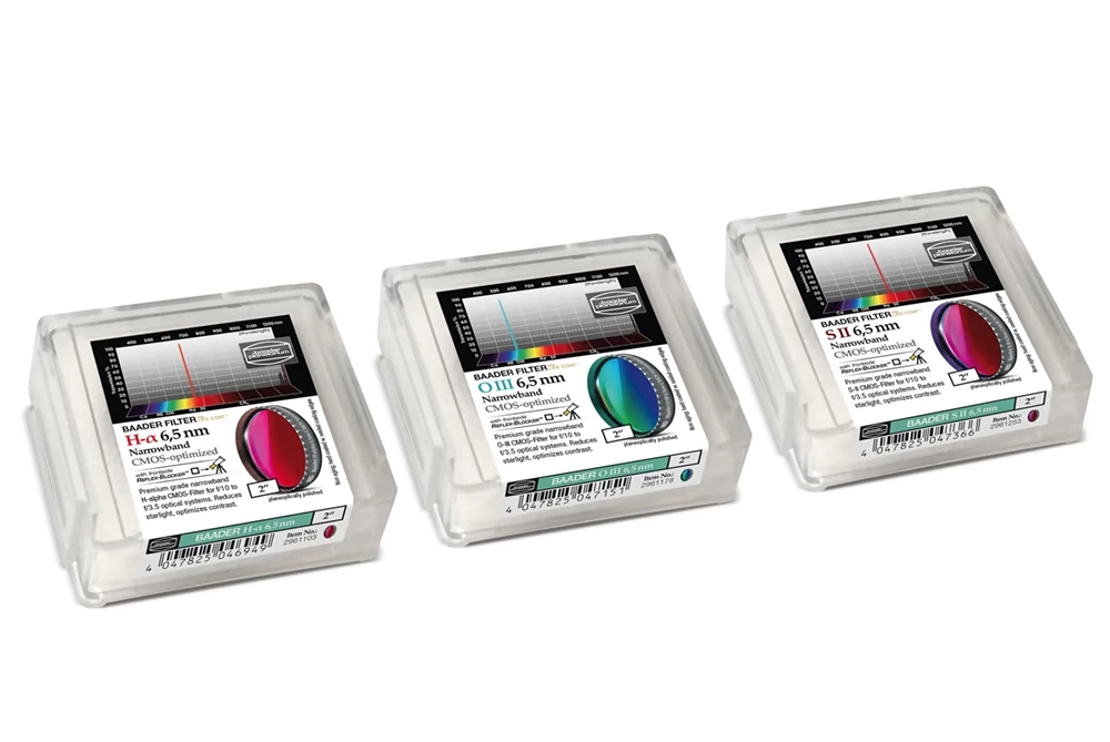 The Baader 2" Narrowband (6.5nm) Filter Set is an excellent choice for astrophotographers who aim to capture the highest contrast images optimized for CMOS but also perform excellently on CCD at H-alpha, H-beta, Oxygen III, or S-II wavelengths. These filters offer outstanding light transmission properties in the selected wavelength range while completely "cutting off" light at other "undesired" wavelengths. They guarantee excellent results when used with telescopes having a focal ratio of f/10 - f/3.5.