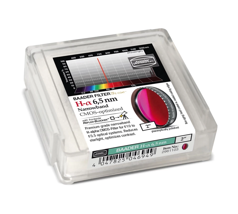 The Baader 2" Narrowband (6.5nm) H-alpha Filter is an excellent choice for astrophotographers who wish to capture the highest contrast images optimized for CMOS, while also delivering outstanding results on CCD at the H-alpha wavelength. The filters exhibit excellent light transmission properties in the H-alpha wavelength range, while completely "cutting off" light at other "unwanted" wavelengths. They guarantee excellent results when used with telescopes having a focal ratio of f/10 - f/3.5.