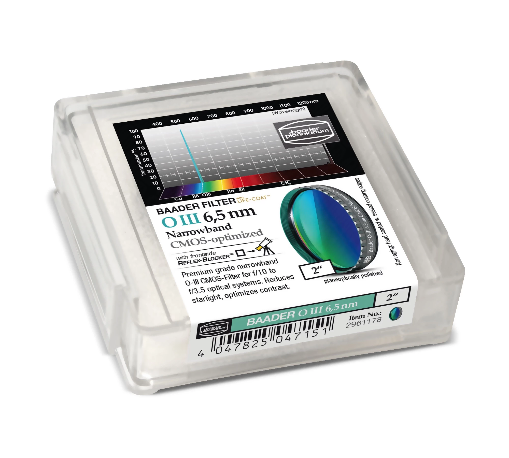 The Baader 2" Narrowband (6.5nm) OIII Filter is an excellent choice for astrophotographers who wish to capture the most contrast-rich images optimized for CMOS sensors, while also delivering outstanding results on CCD sensors at the Oxygen III wavelength. The filters exhibit excellent light transmission properties in the OIII wavelength range, while completely "cutting off" light at other "undesired" wavelengths. They guarantee excellent results when used with telescopes having a focal ratio of f/10 to f/3.5.