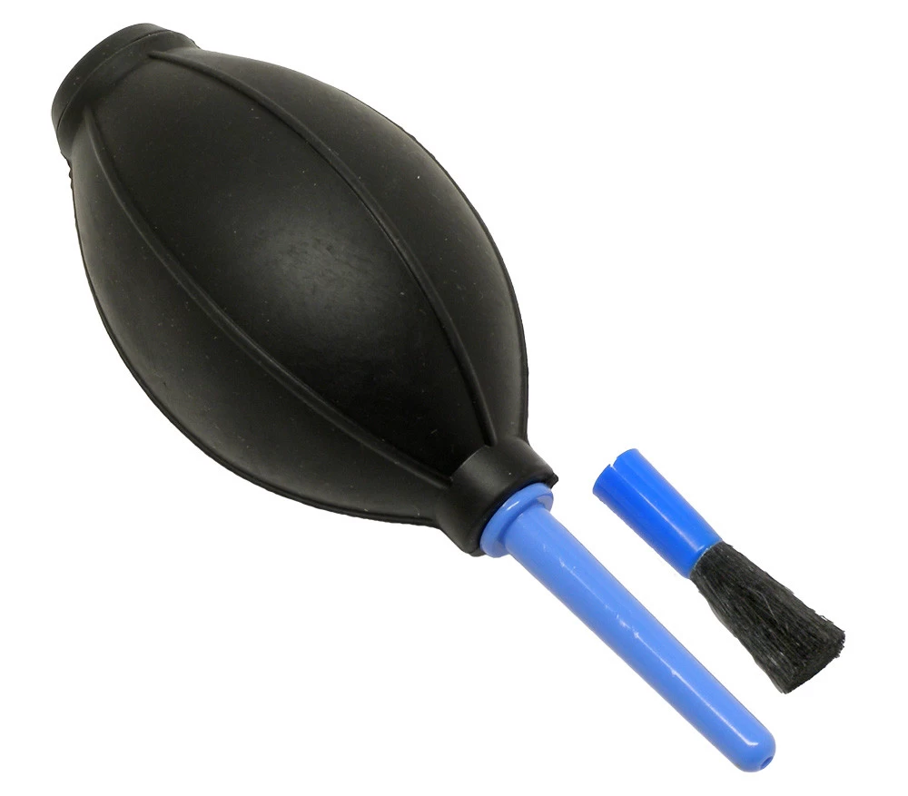 Two tools are commonly used to remove dust particles: an air pump or a compressed air spray. The latter, however, should only be used with good quality spray that does not contain dirt. The air pump or pear pump is always at hand, never runs out, and is handy for optical cleaning.