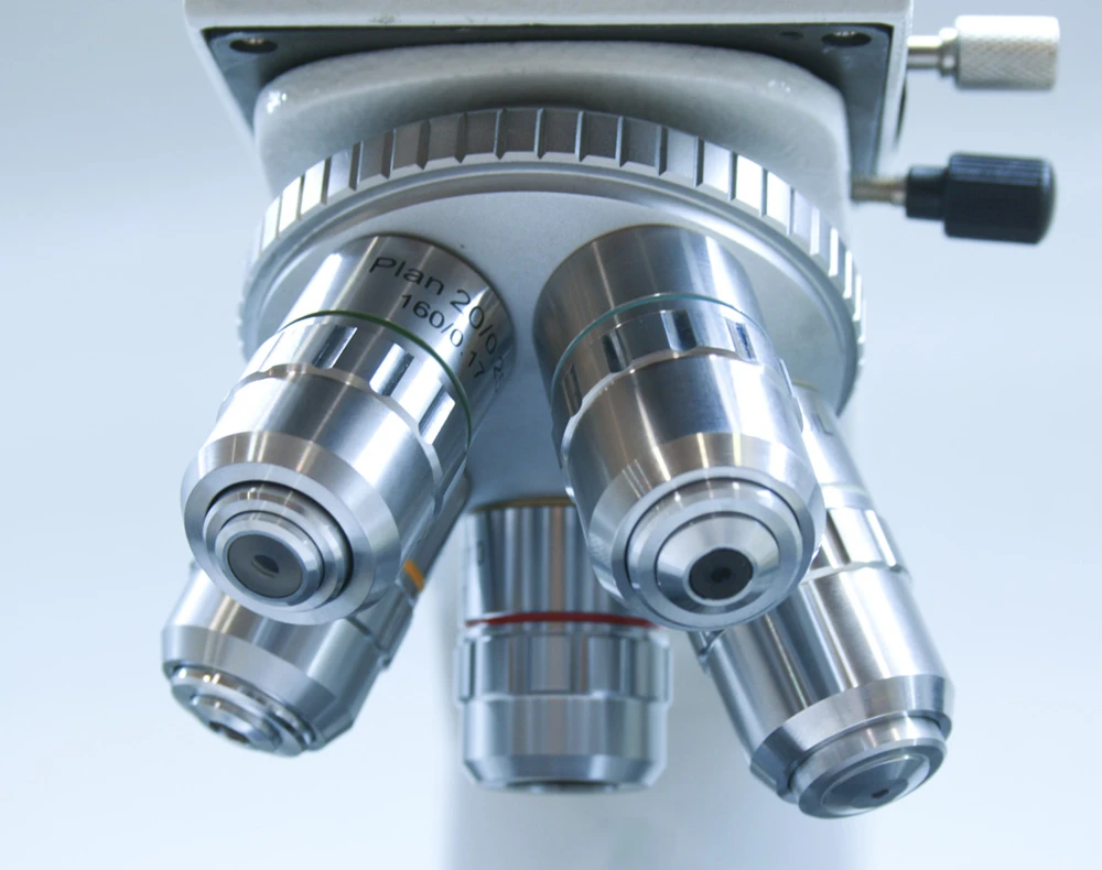 The microscope is equipped with five plan achromatic objectives, which offer better edge correction than semiplan objectives and produce sharp, high-contrast images all the way to the edge of the field of view. The standard equipment includes objectives with magnifications of 4x, 10x, 20x, 40x, and 100x, which are easily interchangeable thanks to their DIN standard connections. The 40x and 100x objectives feature a spring mechanism to protect the slides from accidental breakage. You can choose from three types of wide-field plan eyepieces (WF10x, WF12.5x, WF16x), allowing you to customize magnifications to your needs.