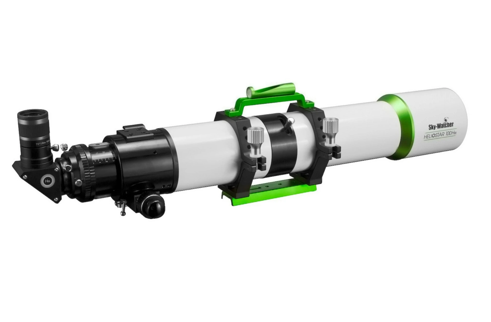 The solar telescope has a diameter of 100 mm, a focal length of 760 mm, and a focal ratio of F/7.6. Focusing is facilitated by a 2" dual-speed Crayford focuser. Finding the Sun is a quick and easy task with the solar finder built into the handle that holds the tube rings together.