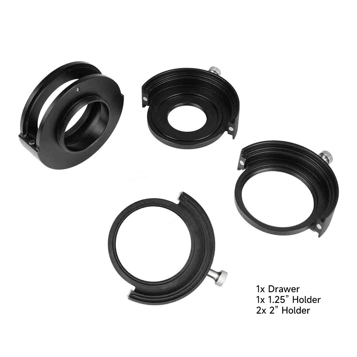 The Svbony Filter Holder Set with Drawer contains almost everything you'll need for filter use. We especially recommend this product for amateur astronomers who are often out in the field, or astrophotographers working with a colour camera under the city sky, as using one or two filters does not necessarily require a large and heavy filter changer. The kit makes it quick and easy to switch between filters. You can use both 2" and 1.25" filters using the included 2" to 1.25" adapter. The filter drawer uses a 21 mm light path.