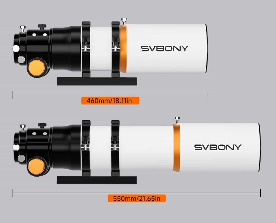 The total length of the Svbony SV503 ED 70 mm f/6.78 quadruplet APO tube with the dew shield extended is 550 mm, and only 460 mm when retracted. Due to the weight of the high-quality materials used, it weighs 2.7 kg, thus still representing the easily portable category.