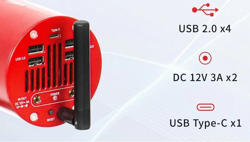 The ZWO ASI 585 MC Air color cooled camera has 4 USB 2.0 ports. The camera is cooled by a 12V supply voltage, for which the manufacturer recommends a minimum of 3A.