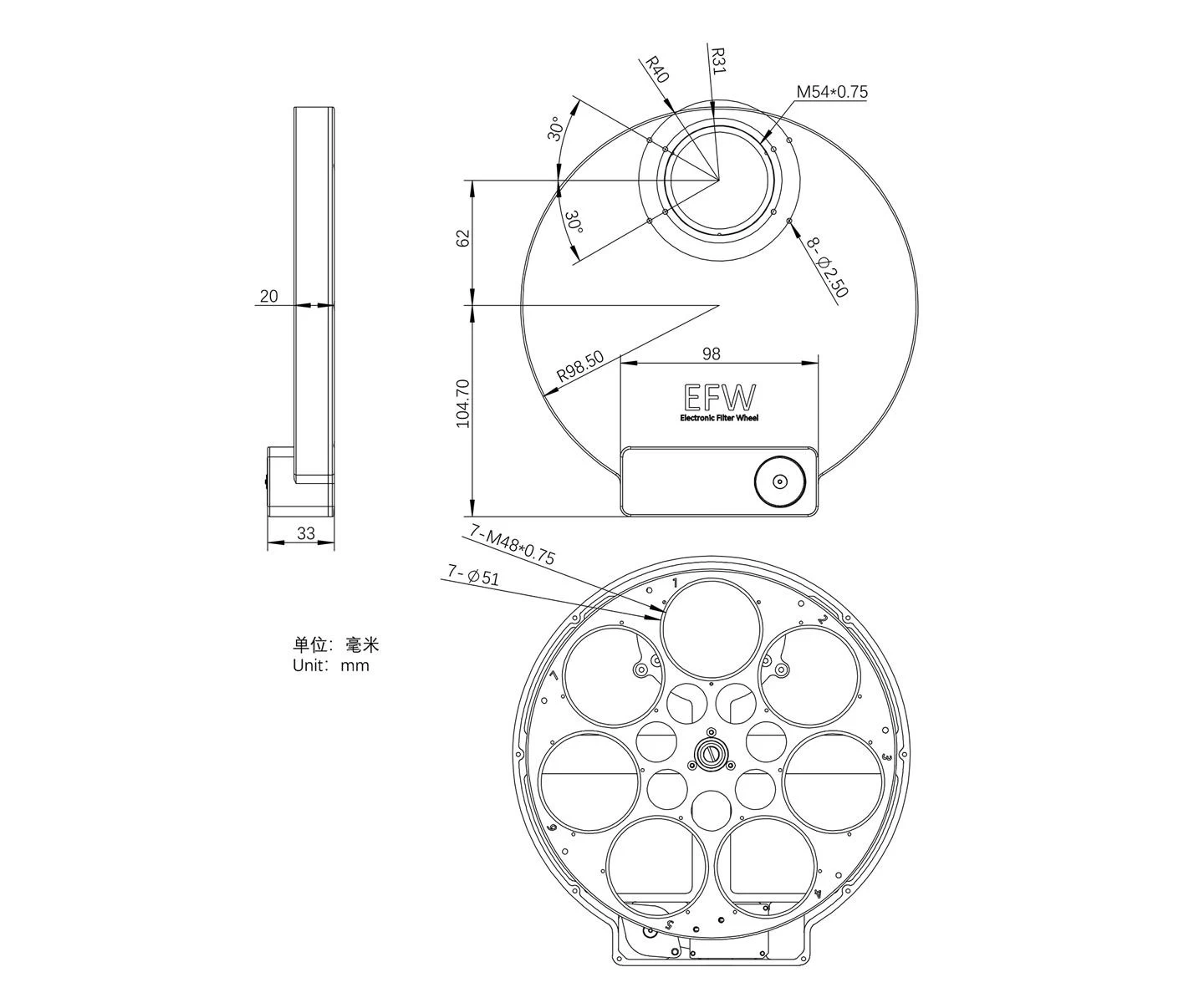 The filter changer has T2 or M54 (7×2" model) threads on both sides for telescope and camera attachment. It can be connected to a computer via USB 2.0 port and, after installing ASCOM's driver, it can be controlled by any compatible software. The filter changer is also powered via the USB 2.0 port, so no need for multiple cables, just a single USB cable is sufficient. The ZWO motorized filter shifter has a maximum current draw of about 120 mA @ 5V, which allows it to be operated from the USB2.0 port of a cooled CCD camera.