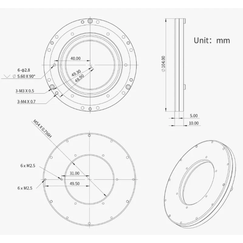 The ZWO tilt adapter (M54) features an M54 threaded connection, compatible with devices such as the ASI 2600, ASI 6200, ASI 2400 cameras, as well as the ZWO EFW 7 x 2" filter wheel.