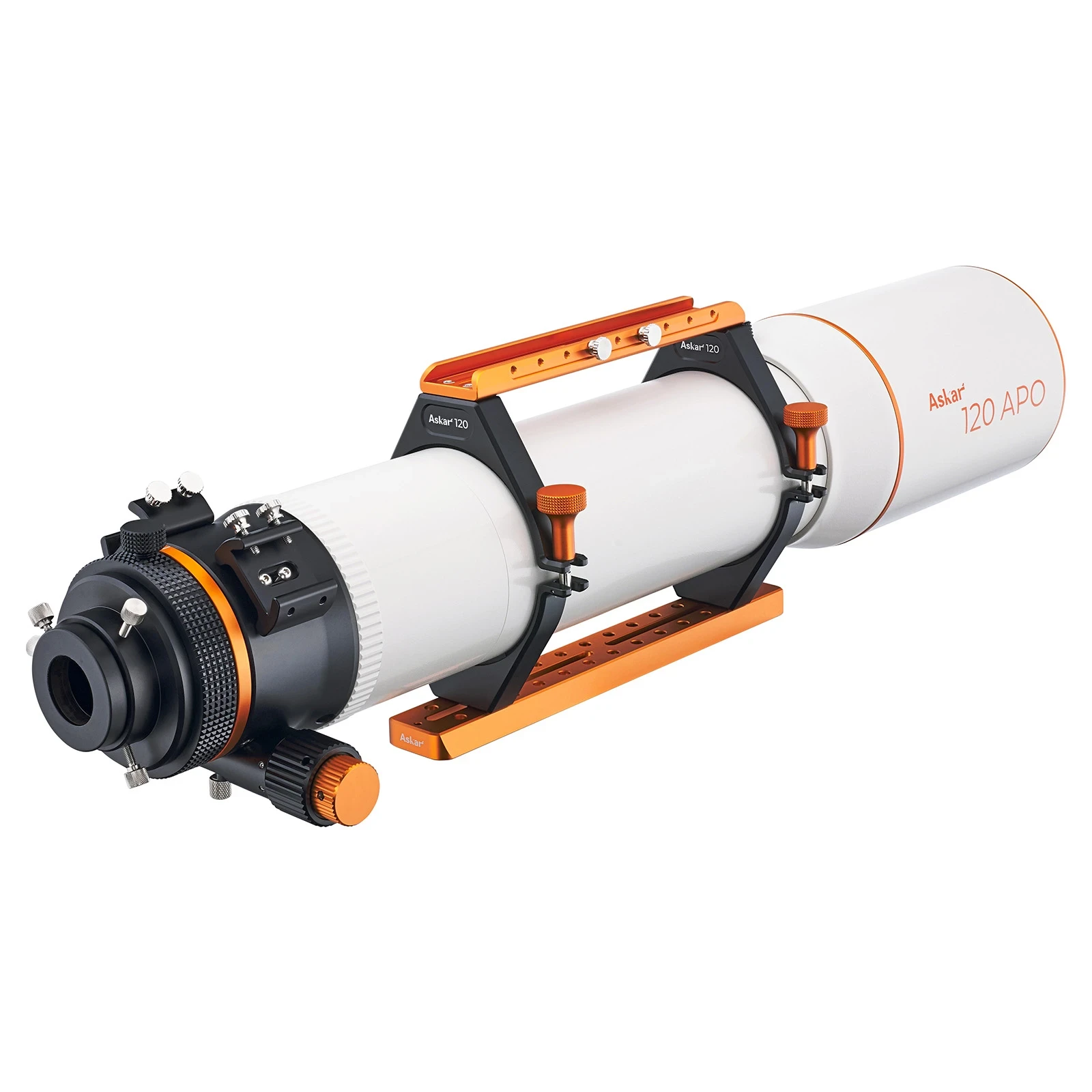 Dizajn tubusu je obzvlášť pozoruhodný vďaka dvom držiakom pre hľadáčiky a multifunkčnej rukoväti, ktoré umožňujú pohodlné a bezpečné používanie. Posilnené tubusové krúžky poskytujú extra stabilitu, čo je nevyhnutné pri dlhších pozorovaniach. Pre Askar 120APO je voliteľne dostupný aj 0,8x reduktor, s ktorým je možné dosiahnuť svetelnosť f/5,6 pri fotografovaní.
