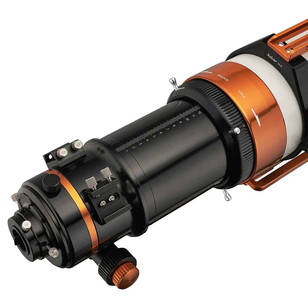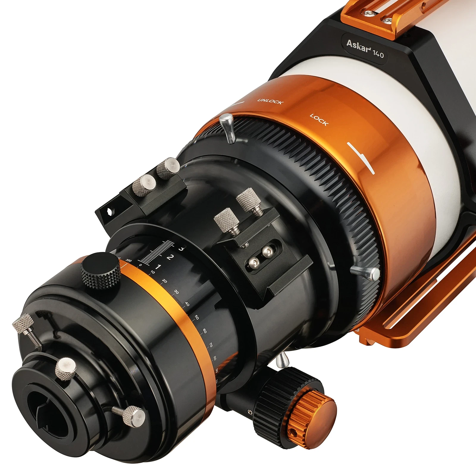 Dizajn tubusu je obzvlášť pozoruhodný vďaka dvom držiakom hľadáčika a multifunkčnej rukoväti, ktoré umožňujú pohodlné a bezpečné používanie. Spevnené krúžky tubusu poskytujú extra stabilitu, čo je nevyhnutné pri dlhších pozorovaniach. K Askar 140APO je voliteľne dostupný aj 0,8x reduktor, s ktorým získame systém s svetelnosťou f/5,6 pri fotografovaní.
