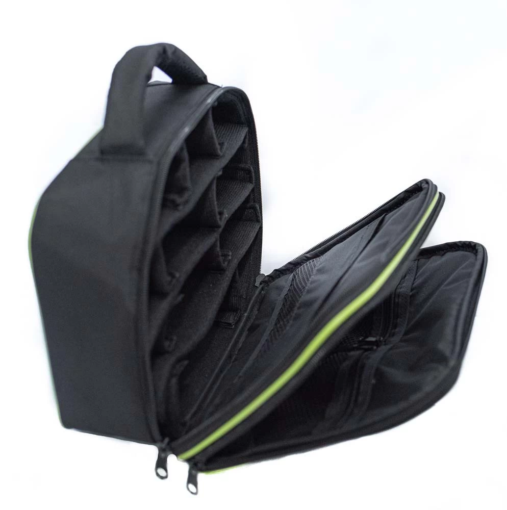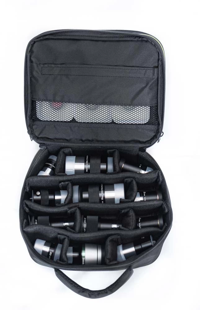 A közepes hordtáskába 1.25-ös és 2"-os okulárok, zenittükör, szűrők és adapterek, észlelő atlaszok és még sok más apróság helyezhető, a külső-belső zsebeknek köszönhetően. A táska 5 mm vastag bélése és erős vászon borítása hatékony védelmet nyújt értékes kiegészítőink számára. A tépőzáras belső térelválasztók segítségével szabadon alakítható a táska belső elrendezése, igazodva a kiegészítők méretéhez.