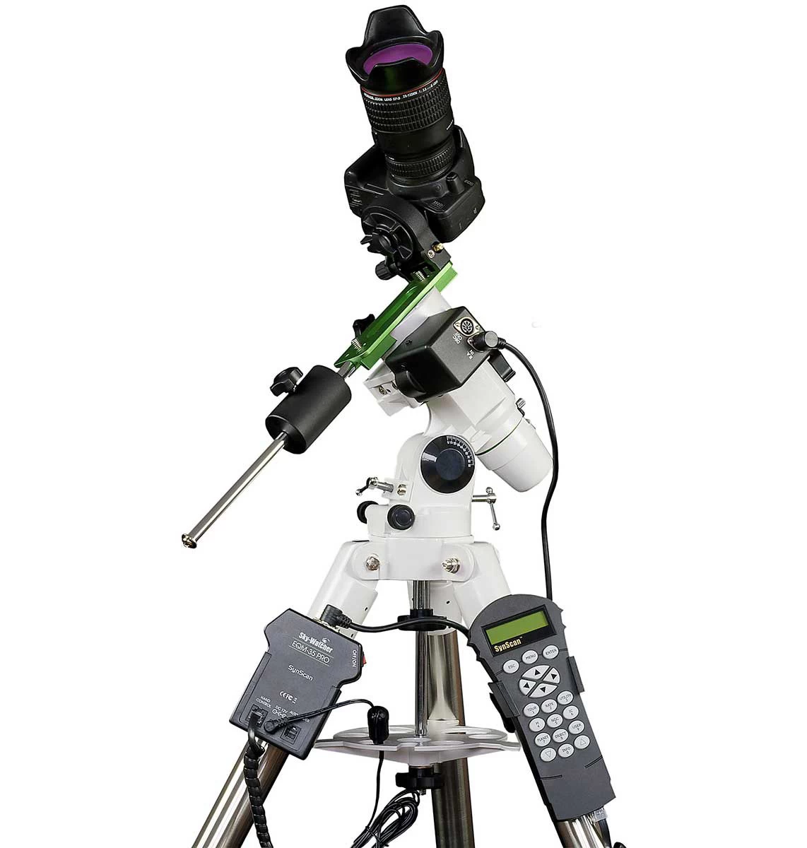 SkyWatcher EQM-35 Pro Goto mechanika sokaknak ismerős lehet akiknek volt vagy van EQ-3-as mechanikája. Pedig ez a modell sokkal több mint elsőre gondolnánk. A mechanikafej az HEQ-5-nél megismert igen stabil acéllábakon nyugszik, a fej pedig tartogat némi meglepetést, azon túl, hogy teljes értékű GOTO funkcióval rendelkezik, még könnyen hordozható asztrofotós mechanikaként is bevethető. Beépített pólustávcsöve segít a pontos pólusra állásban. A fejére bármely Vixen-szabványú prizmasínes távcső felhelyezhető, egészen 10 kg-os tömegig. Áttervezett, megnövelt átmérőjű csigahajtómű kereke minimalizálja periodikus hibák mértékét.