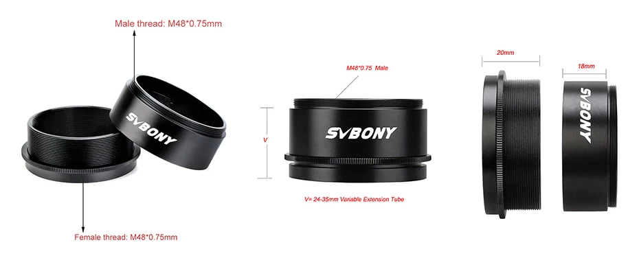 Asztofotós felhasználásra tervezték a Svbony SV109 M48/M48 állítható hosszabbító toldat (24-35 mm) terméket. A M48 hosszabbító toldatok távtartó gyűrűként funkcionálnak, mellyel beállítható, hogy a kamera megfelelő távolságra legyen pl. a távcsövek korrektora mögött.