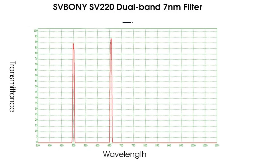 A Svbony SV220 Duo-Band (2") keskenysávú szűrő a Hα (656,3 nm) és OIII (500,7 nm) hullámhosszon 90 illetve 94%-os fényáteresztéssel rendelkezik, melyeken pl. az emissziós ködök sugároznak. Hatékonyan blokkolja a Hold fényét és a fényszennyezést.