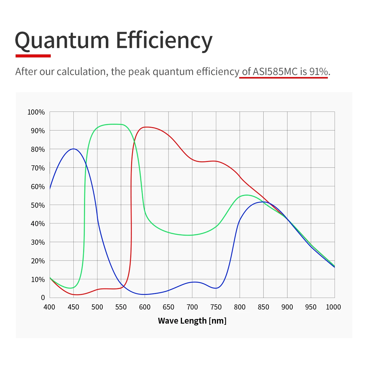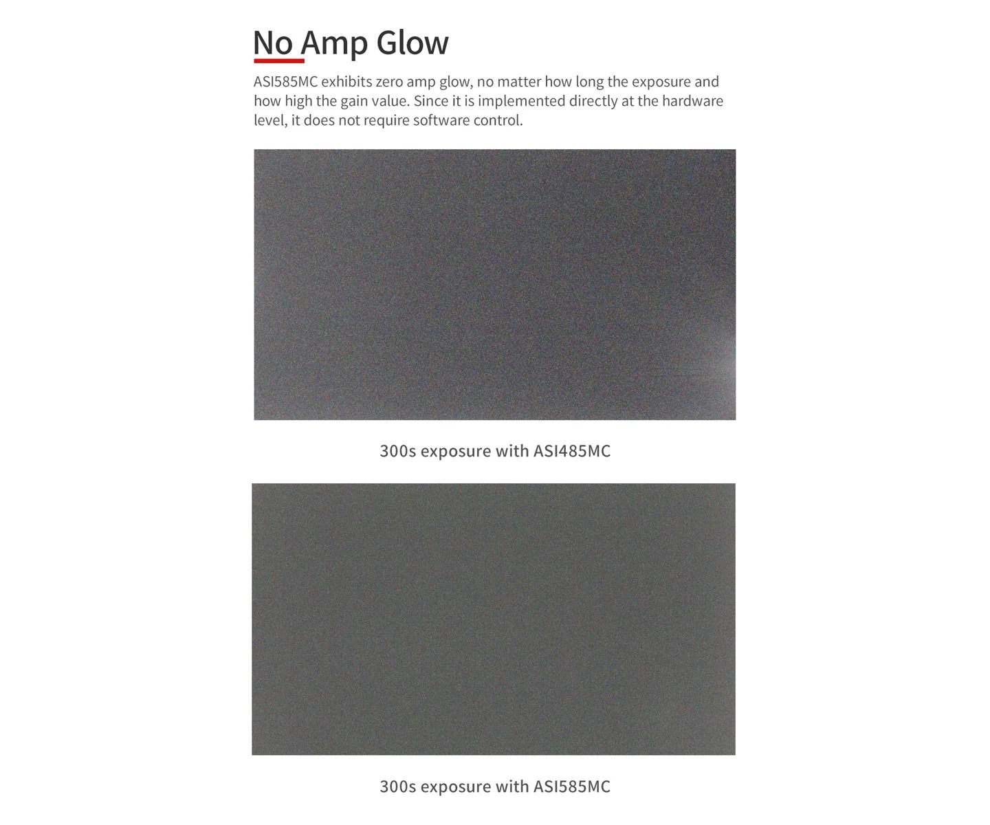 A monokróm kamerákkal szemben a színes, úgynevezett "single shot" kamerák egyszerűsítik azok munkáját, akik nem az L-RGB színszűrős technikával szeretnének felvételeket készíteni. A 8 megapixeles (3840 x 2160) érzékelő extra alacsony kiolvasási zaja a hatékony zajcsökkentésnek hála magas erősítés esetén is alacsony zajszinttel működik hosszabb záridős felvételkészítés közben is. Hosszabb záridejű felvételek esetén a korábbi kameráknál gyakran "befénylés" volt tapasztalható, amit csak utómunkával lehetett kompenzálni. A ZWO ASI 585 MC színes kamera használatával hosszabb (2000 másodperces) záridős felvételek készíthetőek alacsony zajszint mellett, miközben kiküszöbölték a jelerősítéskor tapasztalható "amp glow" vagy "befénylés" hatást is.