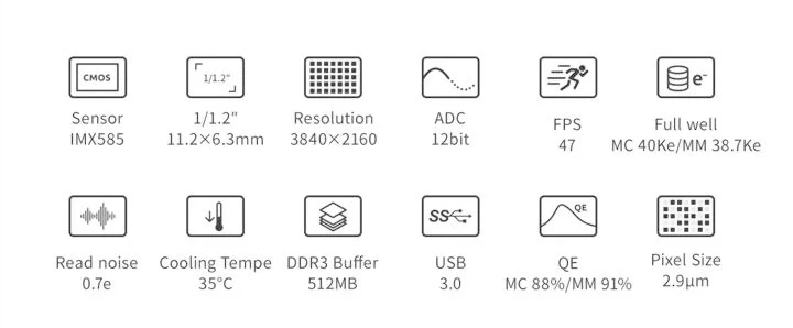 A SONY gyártmányú modern érzékelő tekintélyes 8 megapixeles felbontással (3840 x 2160 pixel), 6.26 x 11.13 mm érzékelőjével és 2.9 µm méretű pixelekkel büszkélkedhet, ezáltal az asztrofotózás számos területén megállja a helyét.
