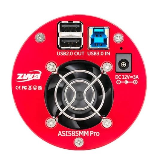 A ZWO ASI 585 MM-PRO monokróm hűtött kamera 2 db USB 2.0 és 1 db USB 3.0 csatlakozóval rendelkezik. A kamera hűtése 12V-os tápfeszültségen történik, melyhez minimum 3A-t javasol a gyártó.