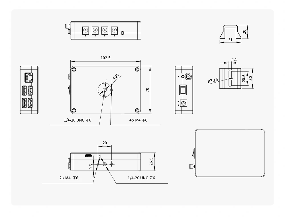 A készülék háza teljes egészében CNC technológiával megmunkált, alumíniumból készült, mely tökéletes védelmet és elegáns megjelenést garantál. Alacsony tömege nem terheli feleslegesen a mechanikát. Az eszköz 102.5 x 70 x 26,5 mm méretű, az oldalán és alján M4 és 1/4" (fotóállvány menet) méretű menet valamint egy prizmasín található, ami nagyszámú felszerelési lehetőséget rejt magában.